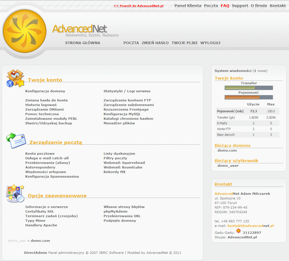 Panel użytkownika to najważniejszy element całego systemu. Pozwala dodawać i usuwać domeny, tworzyć w ich ramach konta e-mail, subdomeny, bazy danych, aliasy i wiele innych - dostępnych dla użytkownika końcowego.
